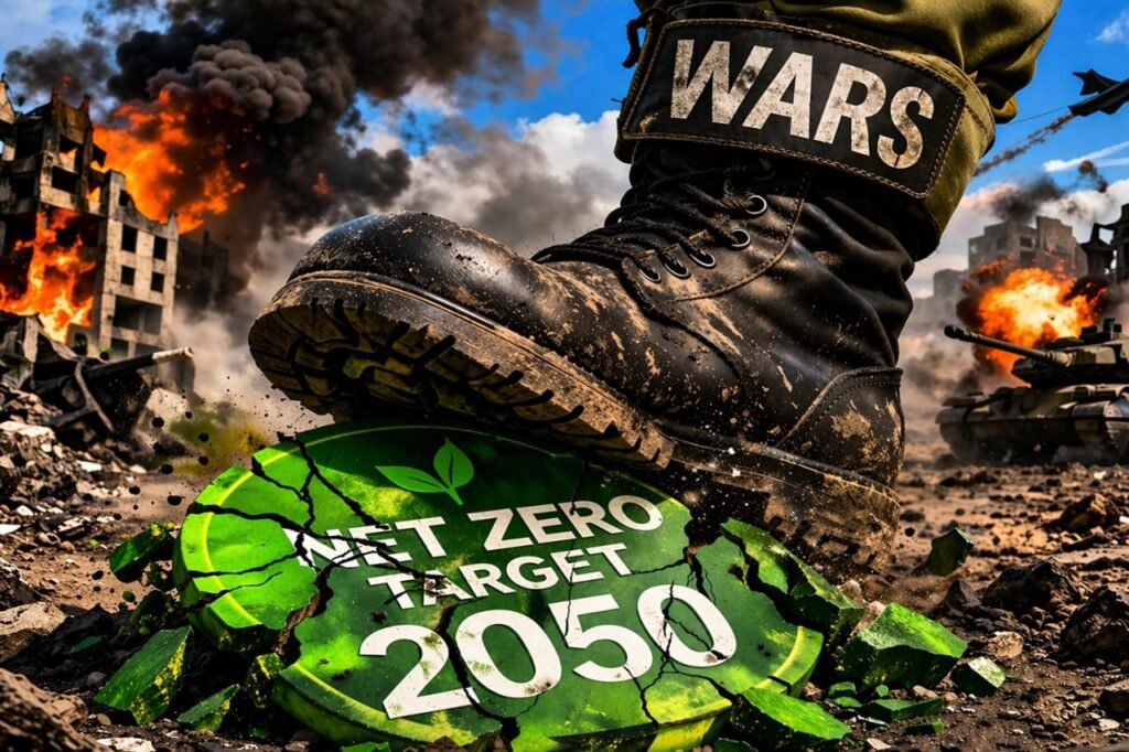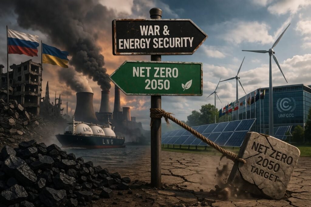 Fig. 1. Net-zero dilemma, war and energy security; a visual juxtaposition of conflict-based fossil fuel revival (coal, LNG, and industrial emissions) and undermined climate pledges, represented by the destabilised Net Zero 2050 target.
